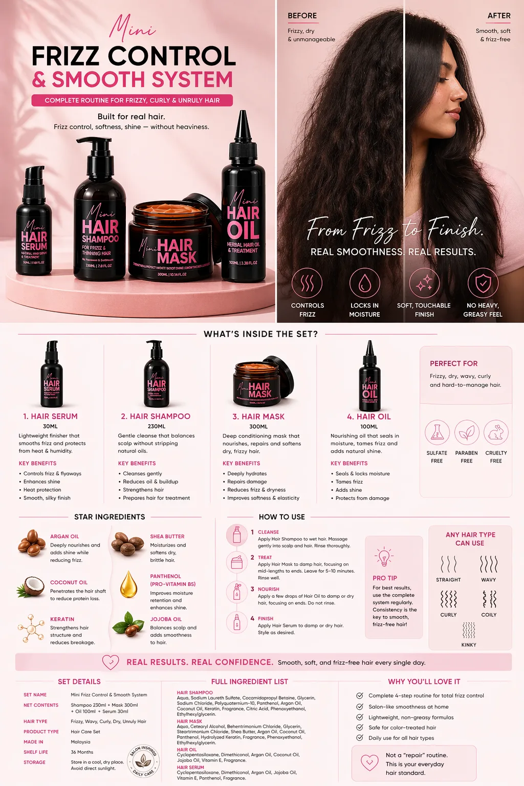 This set is built to smooth, tame, and control frizz from root to finish—especially for wavy, curly, or unruly hair.
